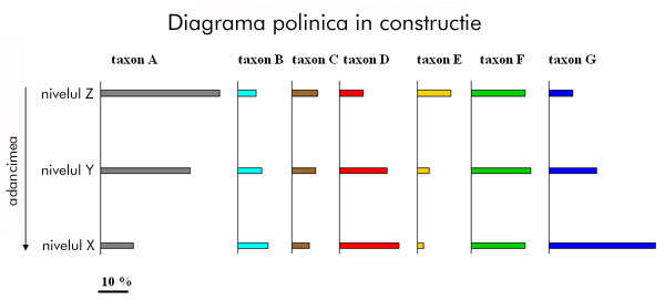 Pentru fiecare nivel se calculeaza procentajul fiecarui taxon, in raport cu totalul grauncioarelor: ansamblul arata spectrul polinic al acestui nivel (care se poate reprezenta printr-o histograma de frecvente).Exemplu : nivelul X